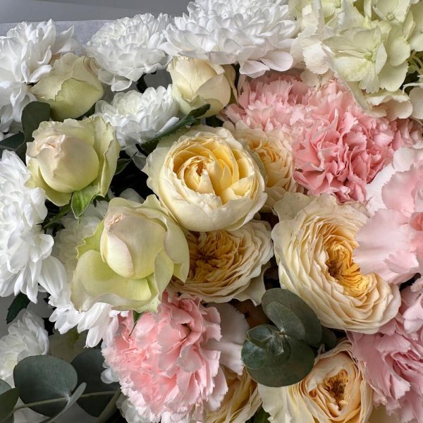 Нежный объемный букет из пионовидных роз, гортензия, диантусов и хризантем станет прекрасным подарком для любого повода.
